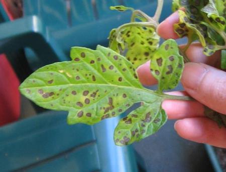 Такі хвороби помідорів, листя при яких покриваються плямами, також дуже небезпечні. Насамперед необхідно провести дезінфекційні заходи для всього інвентарю, але якщо подібна хвороба потрапила на рослину, то його краще знищити.