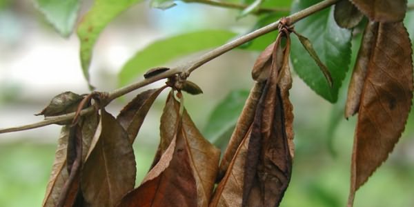Листя ураженої рослини поступово буріють, а потім засихають і опадають. Така рослина вже до кінця липня може скинути листя – це вкрай послаблює його, і воно може просто не перезимувати.
