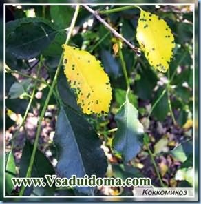 Коккомікоз – хвороба вишні, відома багатьом садівникам. Це грибкове захворювання вражає листя і плоди. Розпізнати коккомикоз можна по дрібним яскравим або світлим червонуватим плям, що утворився на листової пластини. На нижньому боці аркуша з'являються біло-рожеві округлі освіти – суперечки. Заражені листя жовтіє і опадає. Гриб добре переносить зиму в хворих і опалому листі. Навесні в період цвітіння суперечки гриба активізуються. Коккомікоз знижує зимостійкість рослини і в деяких випадках призводить до його загибелі. Боротьба з цим шкідником полягає в проведенні щорічної профілактики. Опале листя обов'язково знищують, восени і навесні перекопують грунт. Ефективним засобом профілактики коккомікоза є обприскування дерев хлороокісью міді і бордоською рідиною. Обприскування здійснюється в 3 етапи. Перший – під час формування бутонів, другий – після цвітіння, третій – після збору врожаю.