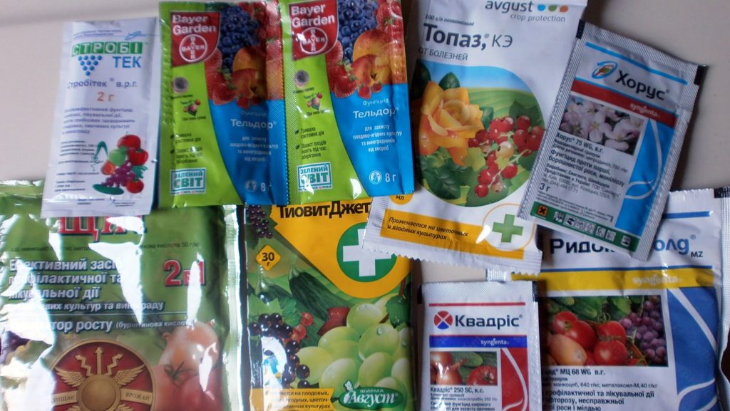 - Квадріс. Новий засіб, який відрізняється широким спектром дії і відноситься до стробілуринів. Його використовують для боротьби з великим переліком захворювань, в їх числі борошниста роса, фітофтора, помилкова роса і плямистість. При попаданні на рослину препарат починає свою дію миттєво.